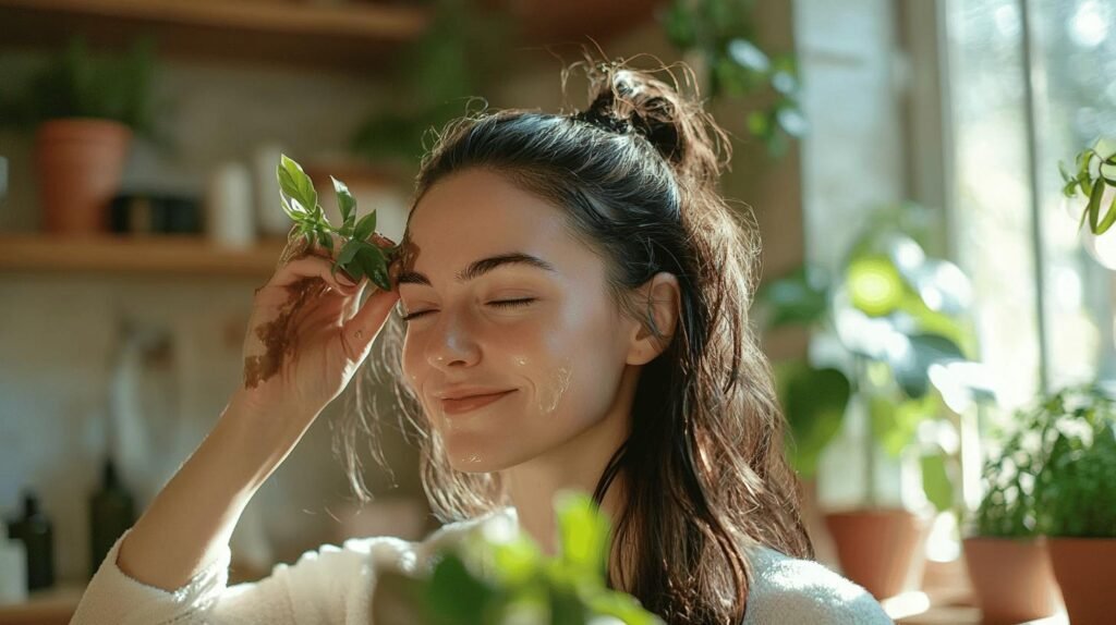 Une femme aux cheveux mouillés et à la peau luisante, les yeux fermés, près de shilajit pur, shilajit en bocal, et de plantes luxuriantes dans une fenêtre éclairée par le soleil.01/10/2025
