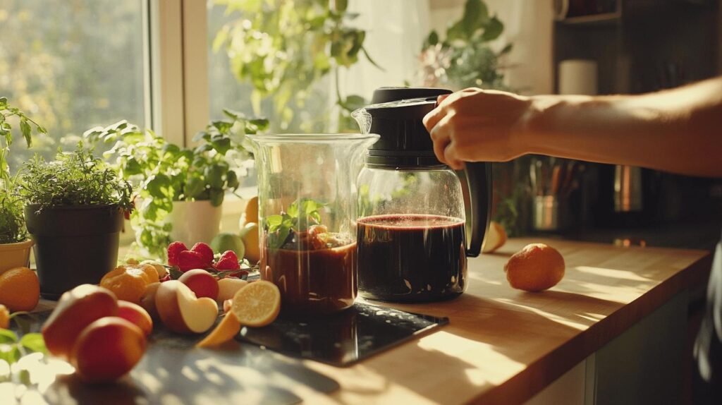 Une personne prépare un smoothie vert sur une table en bois avec du shilajit pur, du shilajit en bocal, de la résine de shilajit, des herbes et des poudres vertes.30/09/2025