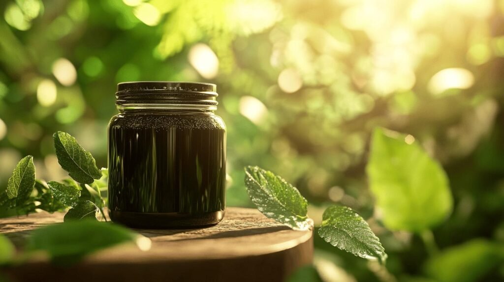 Bien sûr ! Voici votre texte adapté en anglais, intégrant les mots clés "shilajit", "shilajit pur", "shilajit en bocal" et "shilajit resine" de façon naturelle : Un tas de pierres noires brillantes de shilajit repose sur une surface en bois entourée d'herbes et de feuilles vertes, avec du shilajit pur en forme de shilajit en bocal et de la résine de shilajit placée à proximité. Des pots en argile flous et davantage de feuillage sont visibles en arrière-plan tandis qu'une douce lumière naturelle illumine la scène, soulignant la pureté et l'authenticité du shilajit. N'hésitez pas à me demander pour d'autres variantes ou pour la traduction vers le français !.30/09/2025