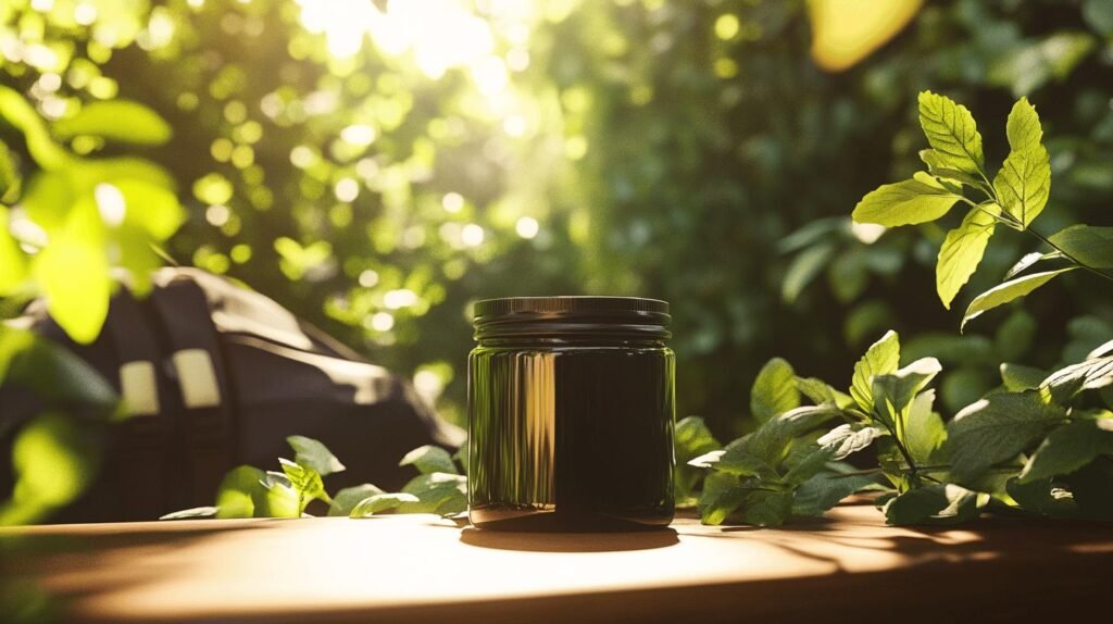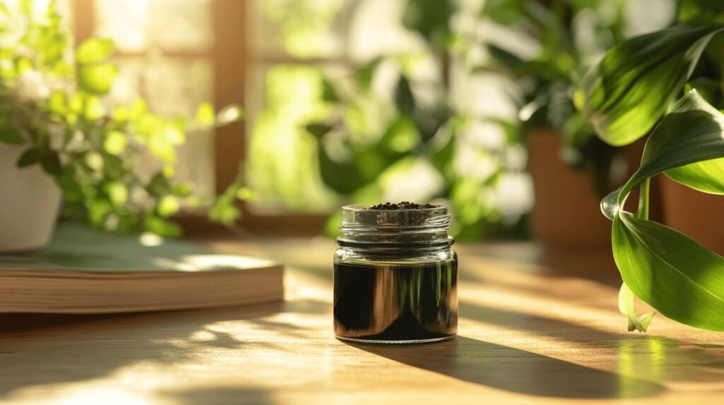 Bien sûr ! Voici votre texte enrichi des mots-clés shilajit, shilajit pur, shilajit en bocal et shilajit résine : Un petit bocal noir de shilajit pur repos sur une table en bois entouré de feuilles de menthe fraîches, de graines noires et d'un verre de liquide naturel doré, le tout baignant dans une lumière chaleureuse. Ce shilajit en bocal contient une résine précieuse de shilajit, réputée pour ses vertus authentiques.30/09/2025